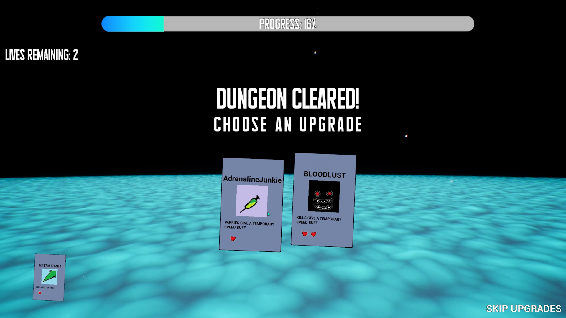 These upgrades range from new abilities like Groundpound to passive boosts like speedboosts on kills or parries. Every upgrade has its own HP — when you die, all your cards take 1 damage.